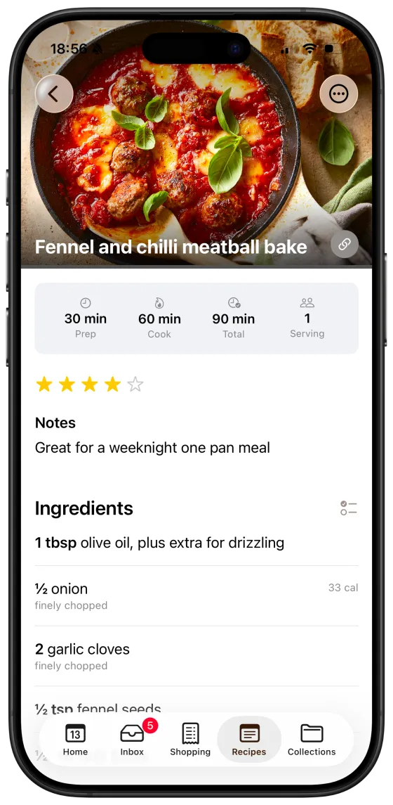 Tweak ingredients, adjust and scale servings, and organise your recipes your way. Your personal cookbook, always in your pocket.